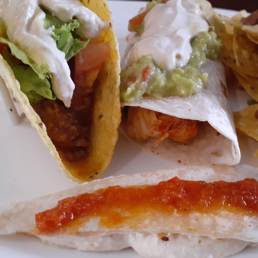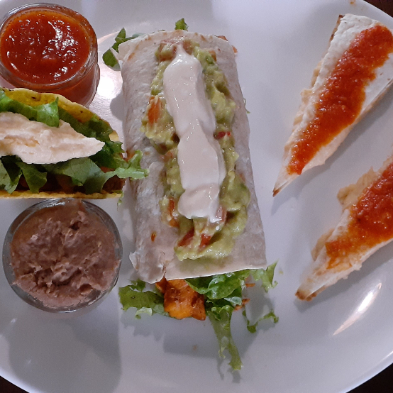 Um taco de carne, meio burrito de frango e duas mini quesadillas (queijo). Acompanham: guacamole, sour cream, salsa mexicana e pasta de feijão (50ml de cada molho). *Obs: Todos os molhos vão separados.