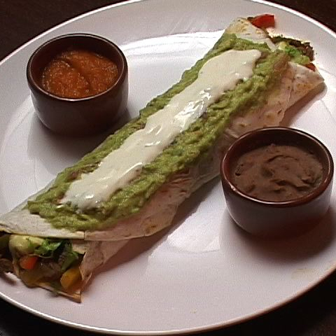 Tortila de trigo com "um recheio a sua escolha" alface e queijo - Acompanham: guacamole, sour cream, salsa mexicana e pasta de feijão (50ml de cada molho). *Obs: Todos os molhos vão separados.