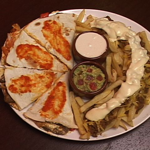 Quesadilla com dois pedaços de carne e dois de frango, um toque de salsa por cima; batatas fritas com chilli beans e queijo derretido. Acompanham: sour cream e guacamole (50ml de cada molho). *Obs: Todos os molhos vão separados.