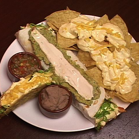 Um burrito de frango, um taco de carne e porção de chips de milho com queijo. Acompanham: guacamole, sour cream, salsa mexicana, e pasta de feijão (50ml de cada molho). *Obs: Todos os molhos vão separados.