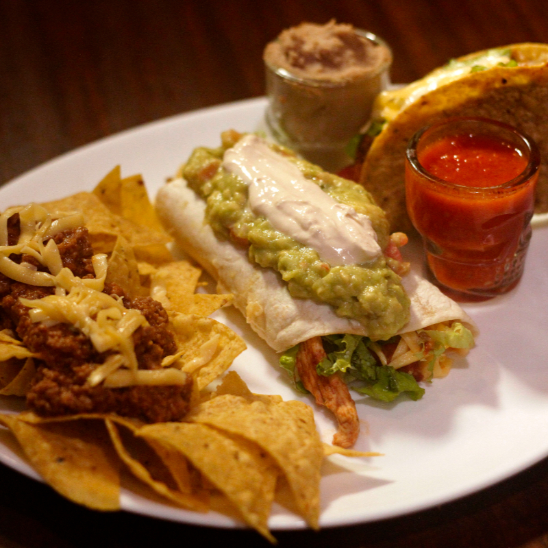 Um taco de frango, um burrito de carne e dois pedaços de quesadillas com um toque de salsa por cima. Acompanham: guacamole, sour cream salsa mexicana e pasta de feijão (50ml de cada molho). *Obs: Todos os molhos vão separados.