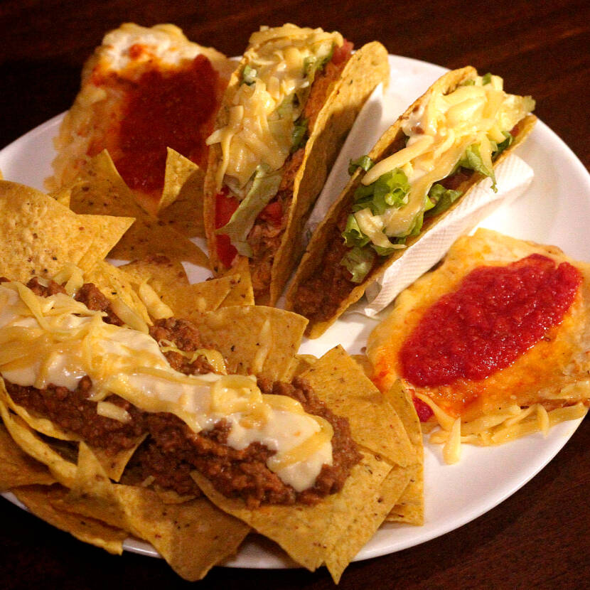 Um taco carne, um taco frango; dois pedaços de quesadilla, nachos, chilli beans. Acompanha queijo derretido (em um pote de 50ml )..