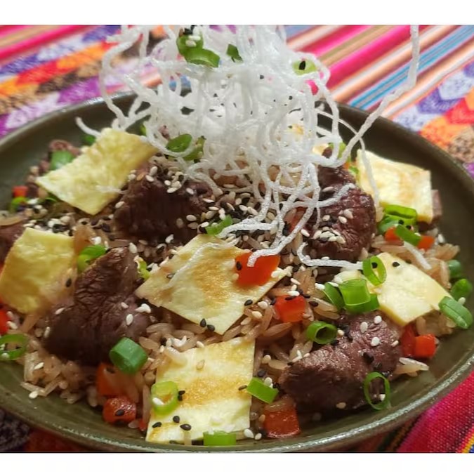 Cortes de filé mignon com arroz frito em molho shoyu, pimentão, cebolinha, tortilha de ovo e óleo de gergelim.