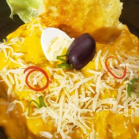 Frango desfiado com pimenta amarela peruana, com toque de queijo parmesão. Servido com arroz, Batata cozida, azeitona e ovo cozido.