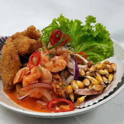 Cortes de frutos do mar crocantes com mandiocas fritas e peixe, milho peruano e salada criolla. “acompanha molho da casa”.