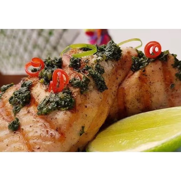 Prato Principal - File de salmão na grelha com salsa chimichurri acompanha legumes e batata doce grelhada + Sobremesa do Dia
