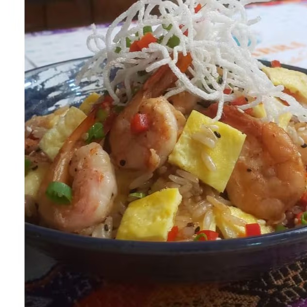 Camarões fritos salteado ao wok com arroz branco ,shoyu ,pimentão vermelho,cebolinha e tortilha de ovo e gergelim