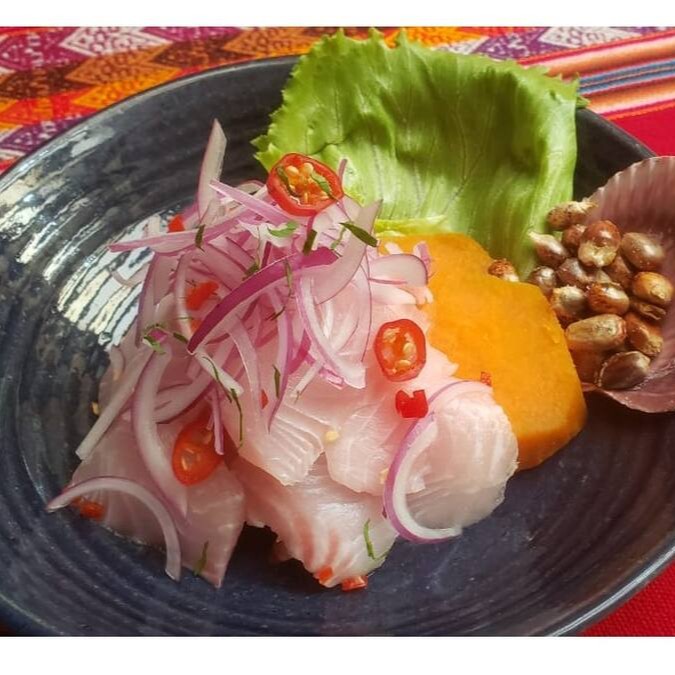 360 gr de peixe branco, cebola roxa, limão, pimenta, batata cozida ou mandiocas cozidas. Acompanha milho crocante.