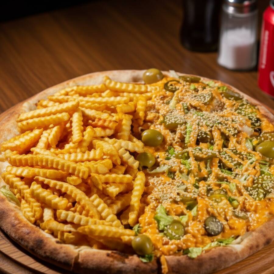 Pizza Grande metade sabor Big Mac (Hambúrguer, queijo ,cebola ,picles, molho especial e gergelim) Metade sabor Batata frita (mussarela, bacon, cheddar e batatas fritas por cima) 1 Coca Cola de 2 litros