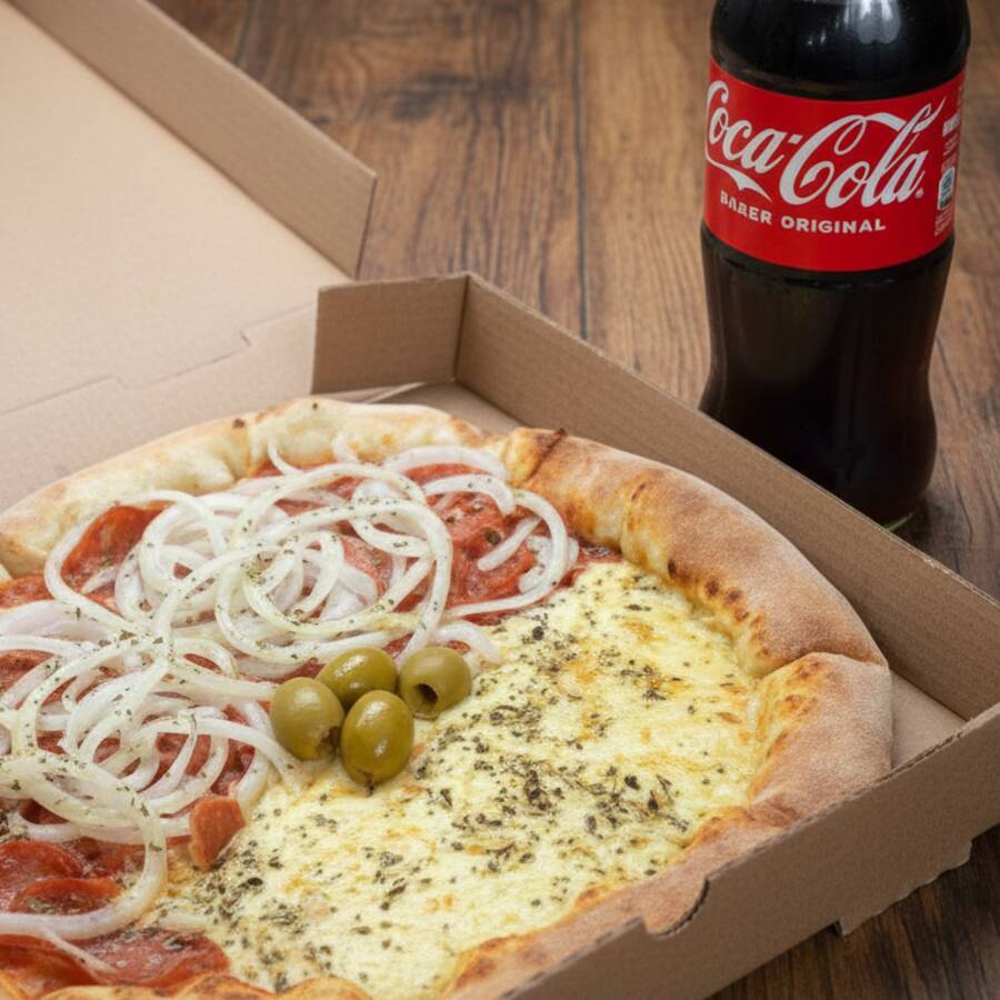 Pizza meia mussarela meia calabresa + coca 2 litros
