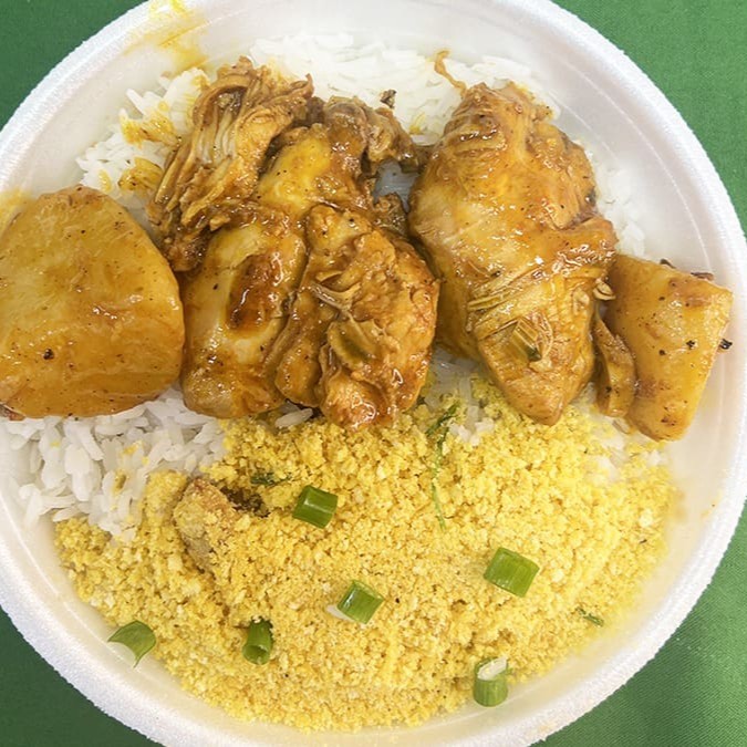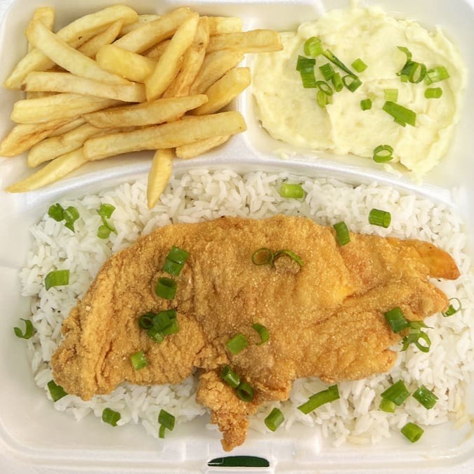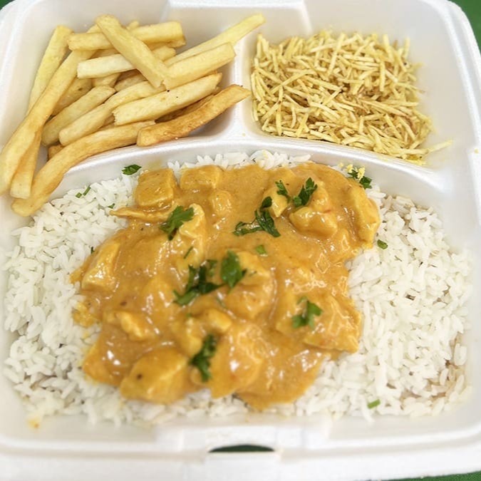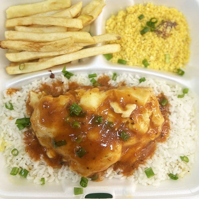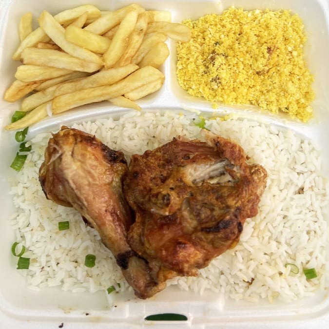 Arroz, feijão, farofa, batata frita e frango assado na brasa