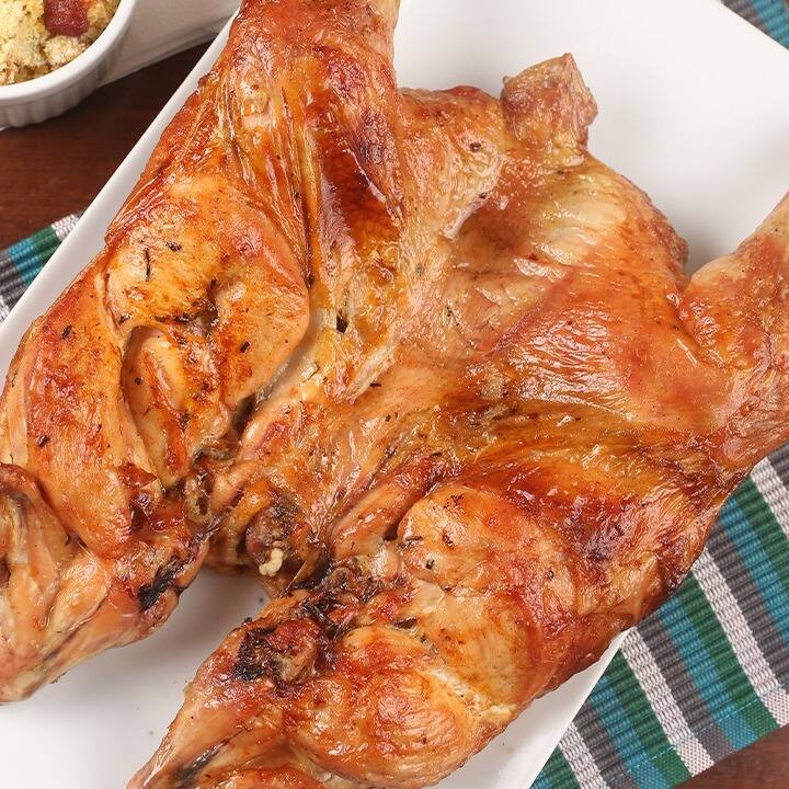Delicioso frango assado na brasa. Acompanha farofa e vinagrete. Serve 4 pessoas.