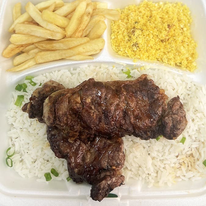 Arroz, feijão, batata frita, farofa e contra filé assado na brasa