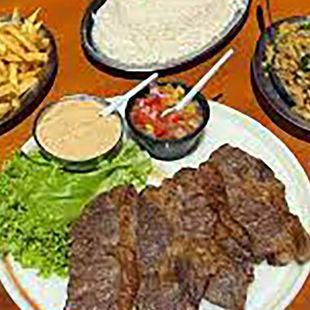 Contra filé assado na brasa, arroz, feijão, batata frita, farofa e salada. Serve 4 pessoas. (poções em marmita tamanho 9 de 1120ml)