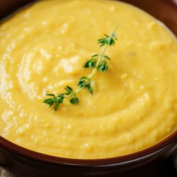 Creme de Batata Doce com alho poró, calabresa picada, azeite, alho e sal. Prato pronto, não alteramos ingredientes. 500ml