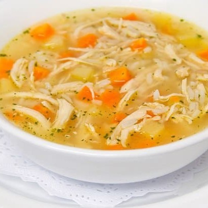 Batata, cenoura, frango e arroz, temperada com caldo de galinha, cebola, alho, azeite, sal e coloral. 500ml Prato pronto, não tiramos nenhum ingrediente.