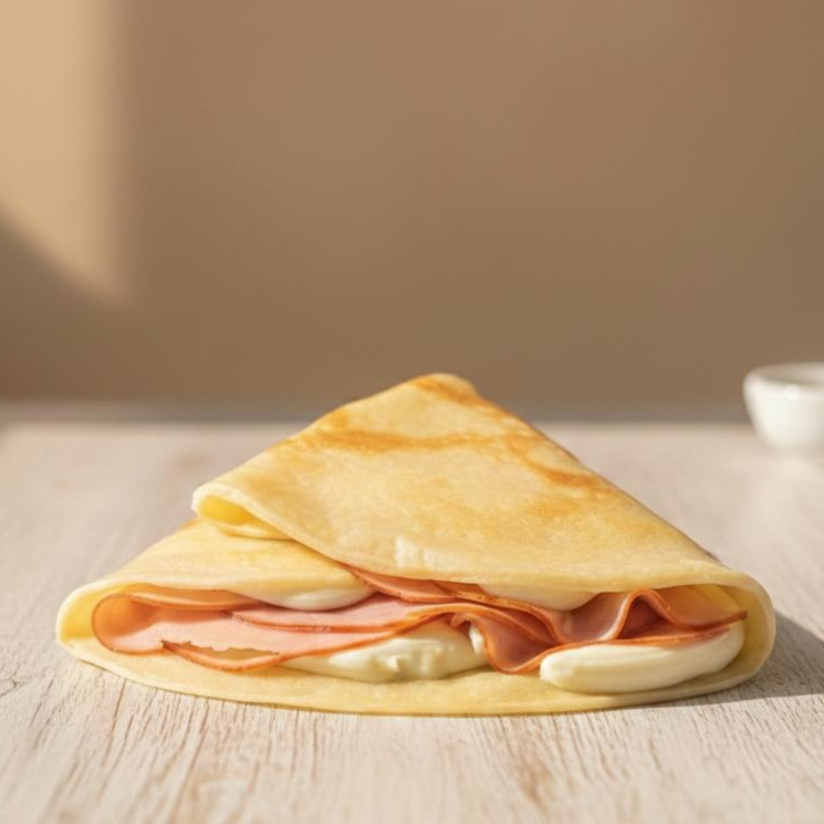 Um crepe bem recheado com presunto, queijo mozzarella e tomate cereja e oregano, envolto em uma massa fina, perfeito para um lanche sofisticado.