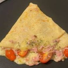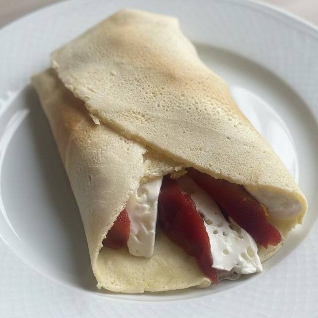 Um crepe bem recheado com presunto, queijo mozzarella e tomate cereja e oregano, envolto em uma massa fina, perfeito para um lanche sofisticado.
