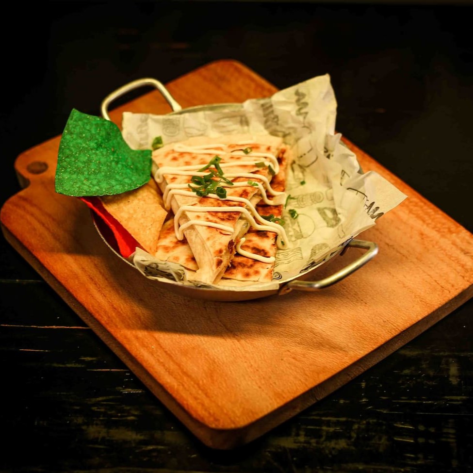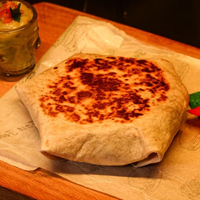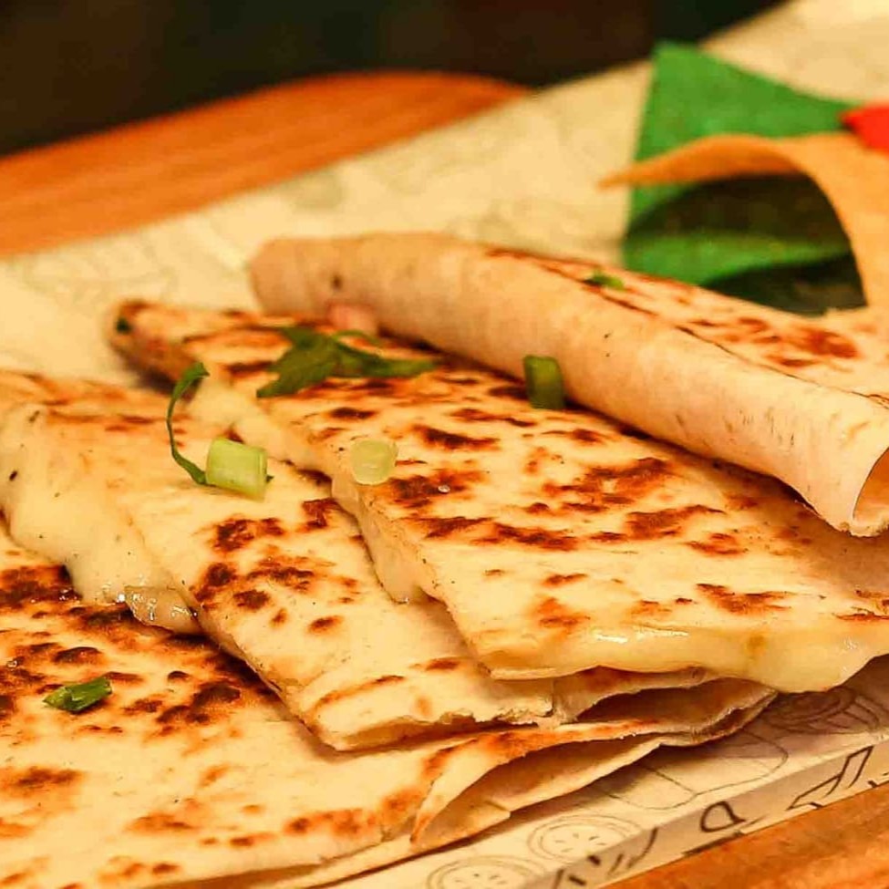 É uma Tortilla de trigo macia tostada na chapa, recheada com queijo derretido, Jalapeno, Totopos de milho , sour cream, pico de gallo , Guacamole e bacon+ o seu recheio favorito. -Carne -Frango -Pernil -Cupim