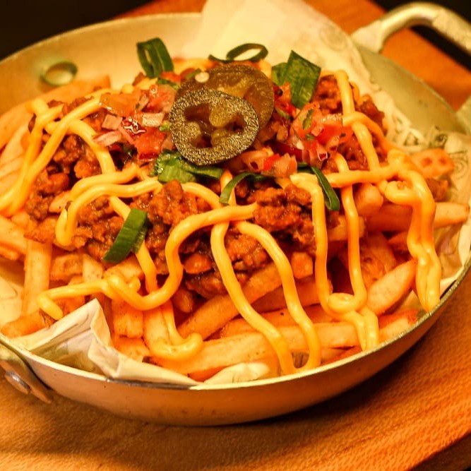 Deliciosas Batatas Fritas crocantes com chilli de carne, queijo gratinado e pimenta jalapeño. Feito para ser compartilhado. #tags: Chilli, pimenta, batata.