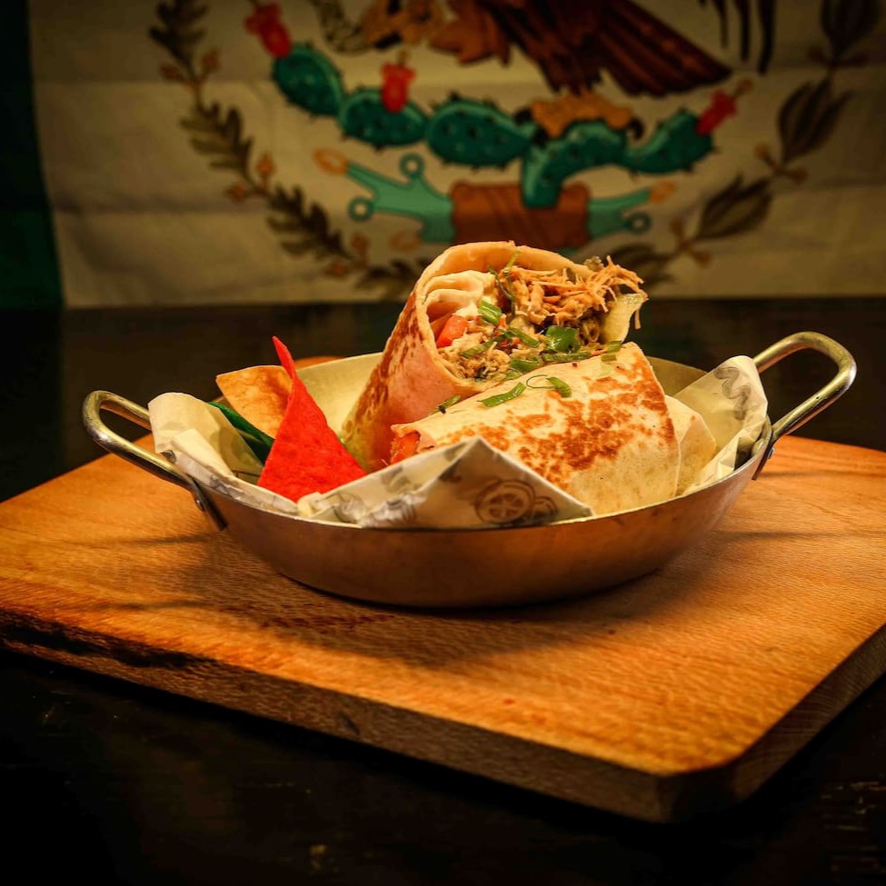 Tortilla de trigo recheada com Pernil à mexicana, chilli beans, alface americana, guacamole, pico de gallo (vinagrete). Sour cream e pimenta jalapeño. Peso médio 400 g. Serve 1 pessoa