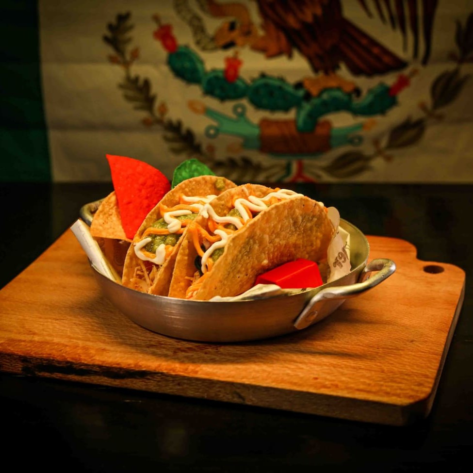 Tortillas de milho em formato de casquinha, recheadas. Acompanha , alface americana, queijo cheddar cremoso, Guacamole, pico de gallo (vinagrete), sour cream, . Peso médio 100 g a 150g. Observações Importantes: - Os tacos podem perder a crocância na viagem !