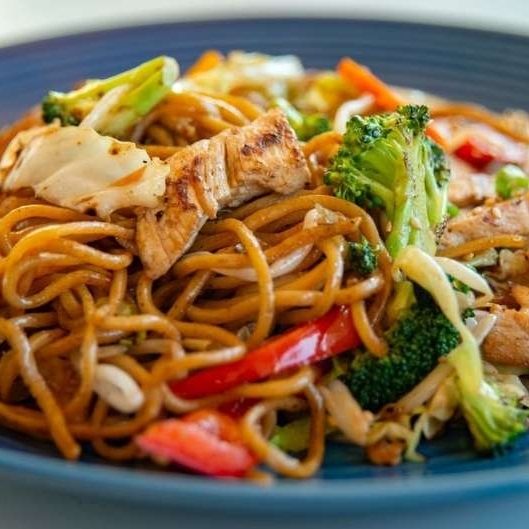 Yakisoba de Frango, cenoura, repolho, brocolis, cebola, pimentao, macarrao e nosso exclusivo molho da casa a base de shoyu.