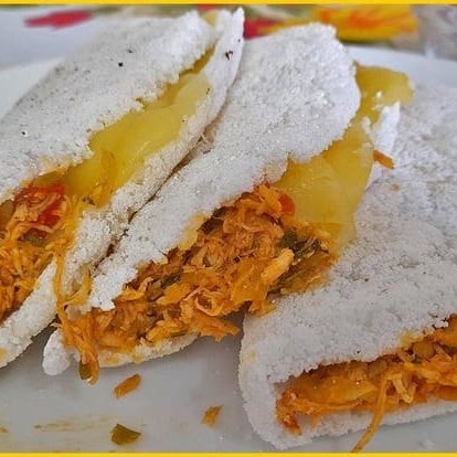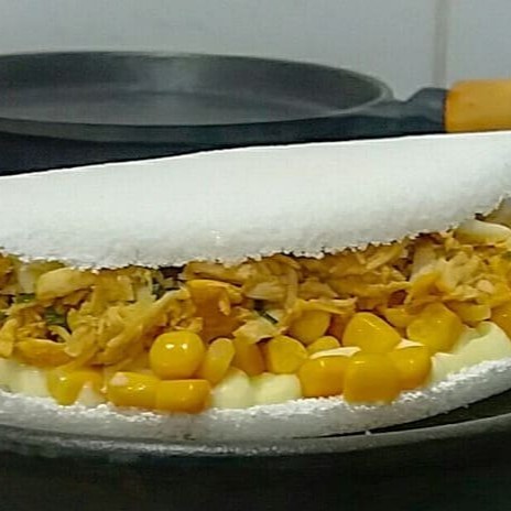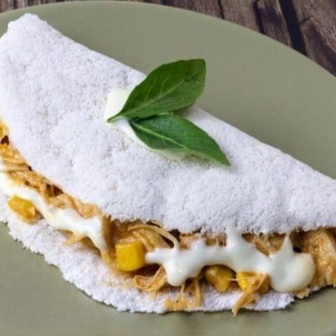 Deliciosa tapioca recheada com frango desfiado, milho e queijo.