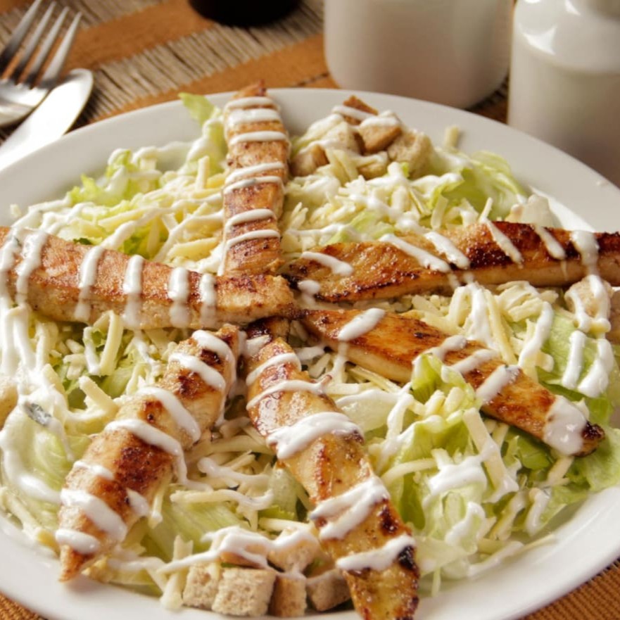 Alface americana, tiras de frango grelhado, parmesão e molho caesar.