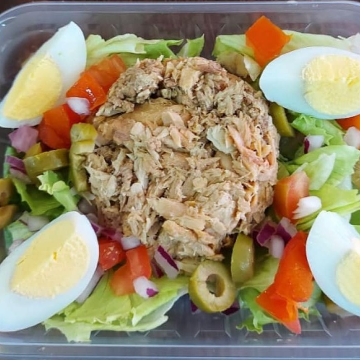 Alface americana, tomate, cebola roxa picada, atum, ovos cozidos, azeitona fatiada e molho shoyu.
