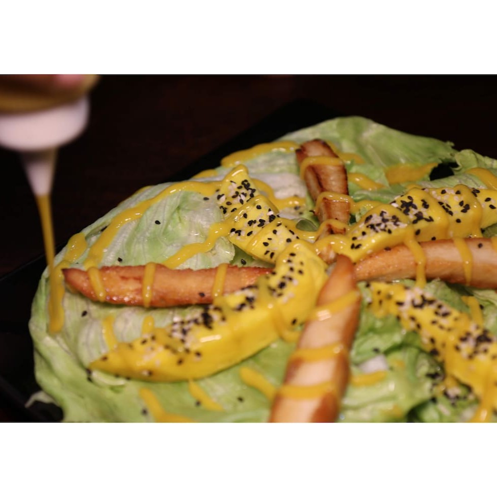 Mix de folhas, tiras de filé de frango, grelhados de tiras de manga, gergelim e molho de mostarda e base de mel.