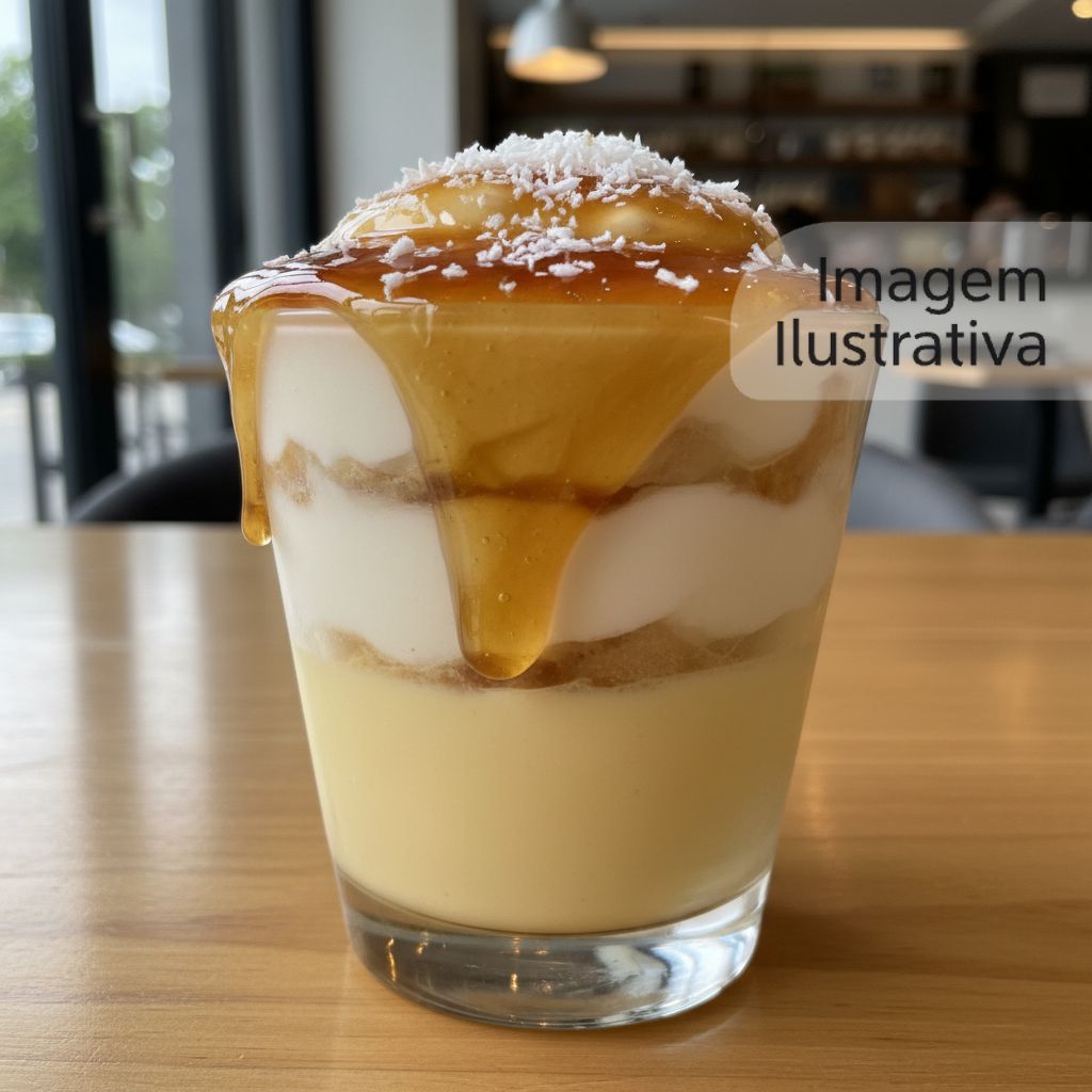 Delicioso pudim com sabor tropical de coco, coberto com uma calda de coco ralado.