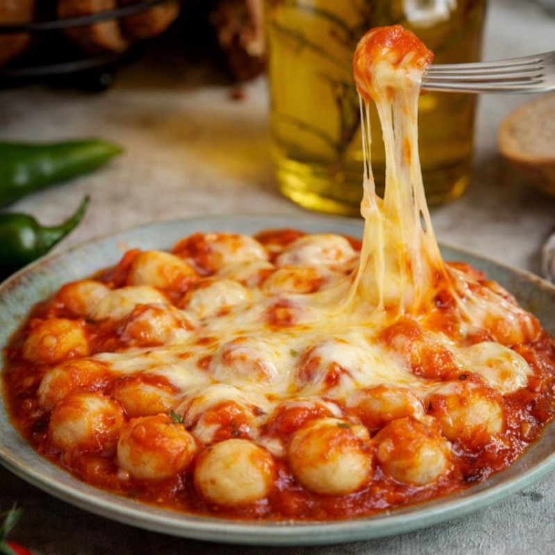 Nhoque ao molho de tomate, finalizado com queijo mussarela. Marmitex serve uma pessoa, escolher o recheio de acordo com a descrição, imagem ilustrativa.