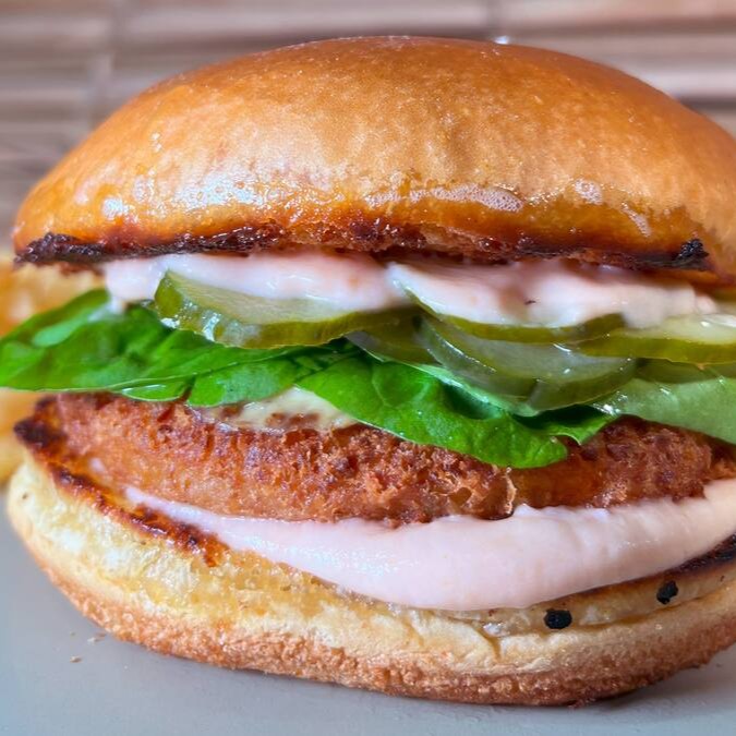 Pão na chapa, Hambúrguer de grão de bico com Vegarela, molho tártaro, tomate, rúcula e pepino.