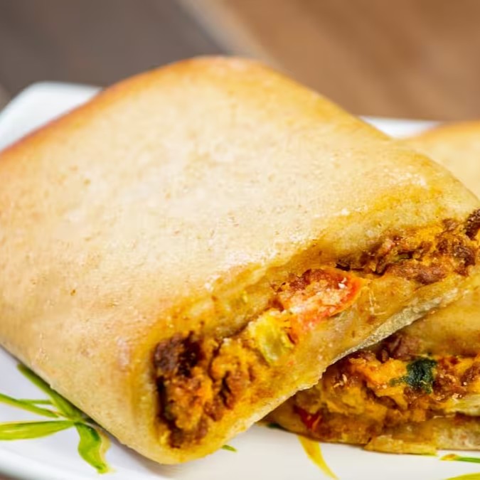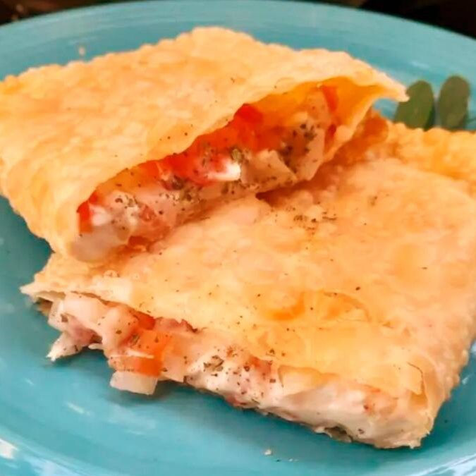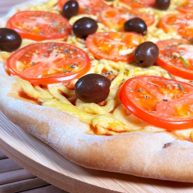Salgado recheado com Vegarela (queijo cremoso vegetal), tomate e orégano (produto pré-assado).