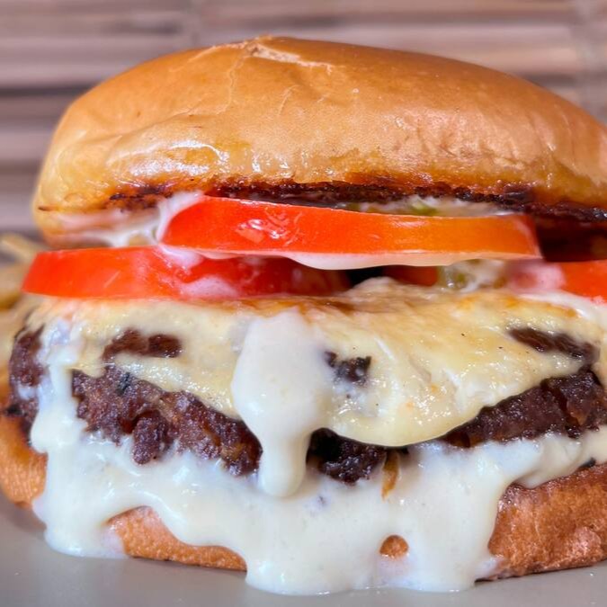Pão na chapa, Hambúrguer de proteína de soja com Vegarela (queijo cremoso vegetal) e tomate.