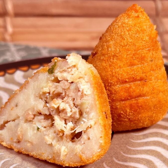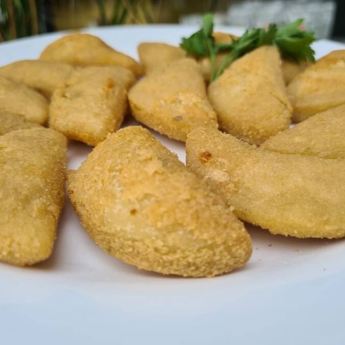 Mini risoles recheado com Vegarela (queijo cremoso vegetal) - produto frito.