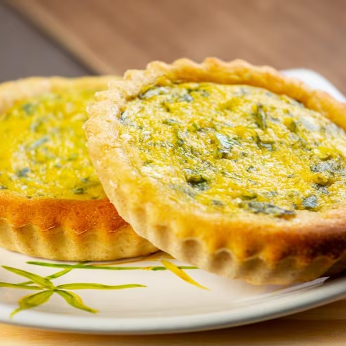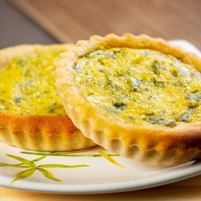 Quiche recheado com Vegarela (queijo cremoso vegetal) e alho poró (produto pré-assado).