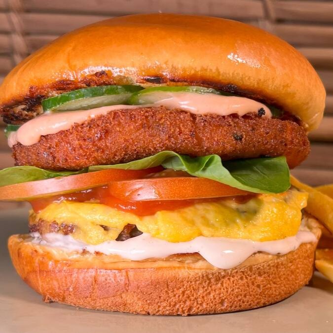 Hambúrguer proteína de soja com * Vegarela, * Catupsoy * (queijo cremoso vegetal), hambúrguer de grão de bico, pepino, tomate, rúcula e molho tártaro.