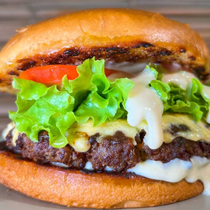 Pão na chapa, hambúrguer de proteína de soja com Vegarela, maionese, alface e tomate.