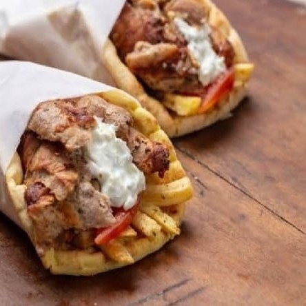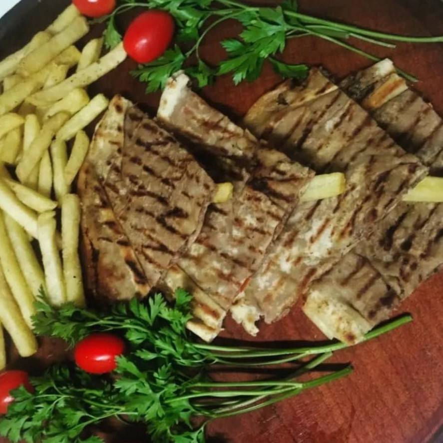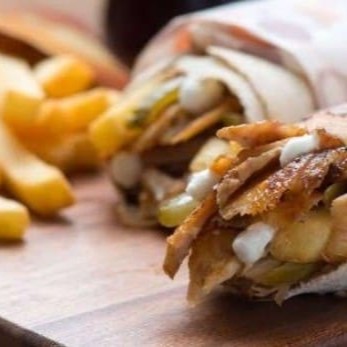 Sanduiche de um pão sírio medio recheado com kafta (Carne moída e cebola temperado) e tostado cortado em 4 pedaços + 150gr de batata frita