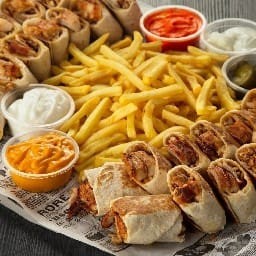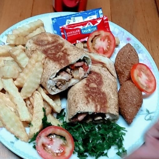 Shawarma de frango (Filezinho de frango desfiado temperado grelhado, tomate, alface e creme de alho enrolados no pão sírio) + 2 Kibes + Batata frita 100g + Coca cola 350 ml
