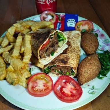 Shawarma de carne (Carne bovina desfiada temperada grelhada, tomate, alface e creme de alho enrolados no pão sírio) + 2 Kibes + Batata frita 100g + Coca cola 350 ml