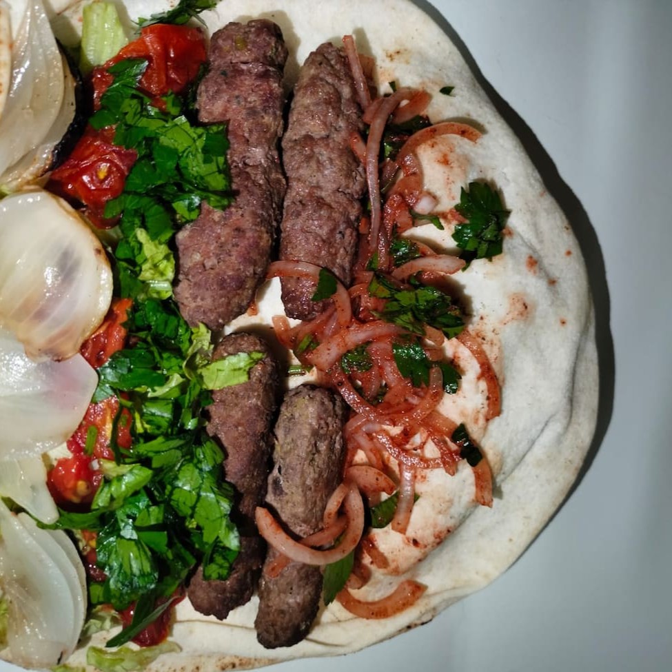Kebeb carne (carne bovina moída temperada grelhada), cebola grelhada, tomate grelhado, salsinha e alface entlrolados em pão árabe.