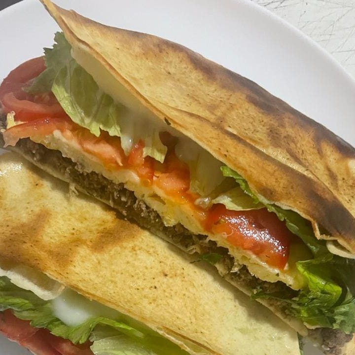 Dois pães sirios tostados recheados com Kafta , tomate, alface, mussarela, creme de alho e ovo frito