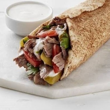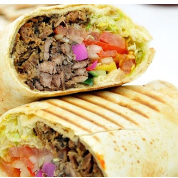 Carne bovina desfiada temperada grelhada, tomate, alface cebola grelhada e creme de alho enrolados no pão sírio
