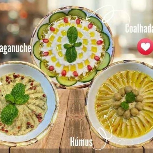Três porção de pastas árabes (Homus,Babaganuche e Coalhada seca ) 100g de cada + dois pães sírios