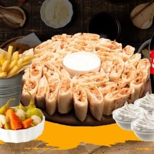 4 sanduíche shawarma frango cortado em 12 pedaços + 4 pasta de alho + batata freita 100 gamas + coca cola 2 litros
