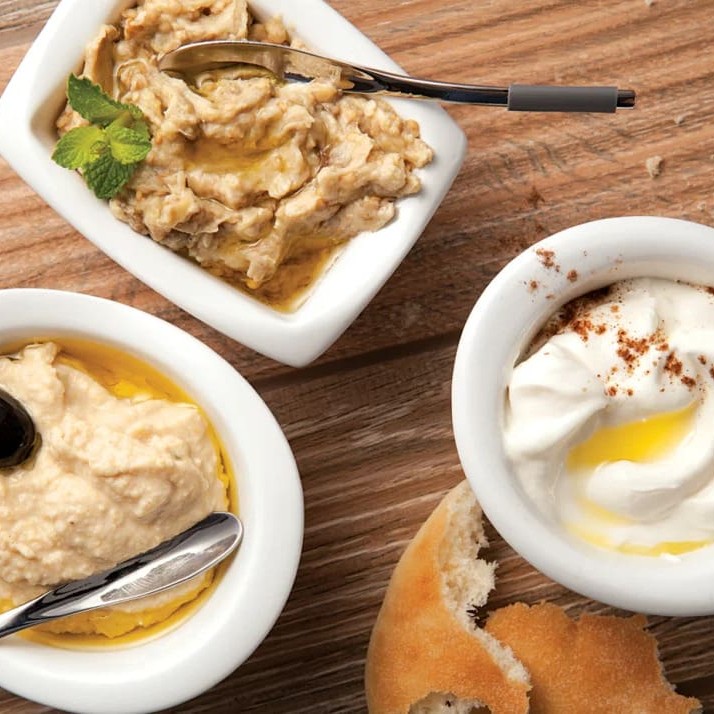 Três porção de pastas árabes (Húmus,Babaganuche e Coalhada seca ) 200g de cada + cinco pães sírios