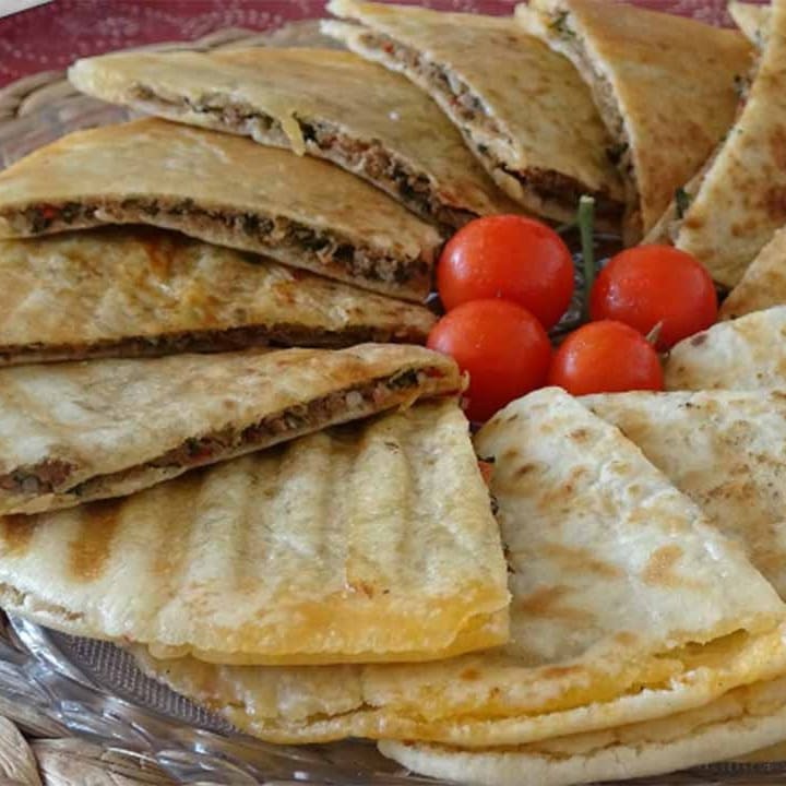 Sanduiche de um pão sírio medio recheado com kafta (Carne moída e cebola temperado) e tostado cortado em 4 pedaços.